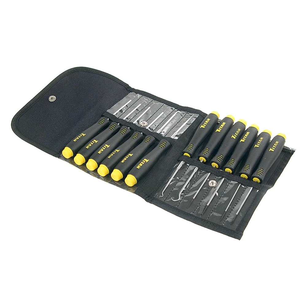 12-piece Pick Set by Titan Tools®. This top-grade product is expertly made in compliance with stringent industry standards to offer a fusion of a well-balanced design and high level of craftsmanship. Manufactured from industry-leading materials using up-to-date equipment, it ensures everlasting reliability and enduring value. This product is distinguished by total quality assurance, unsurpassed by anybody else.