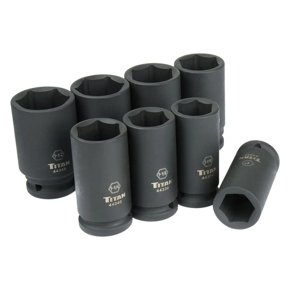 3/4″ Drive SAE 6-Point Deep Impact Socket Set (8 Pieces) by Titan Tools®. This product is made of high-quality materials to serve you for years to come. Designed using state-of-the-art technology and with customers in mind. It will meet your needs and deliver great quality at an affordable cost.