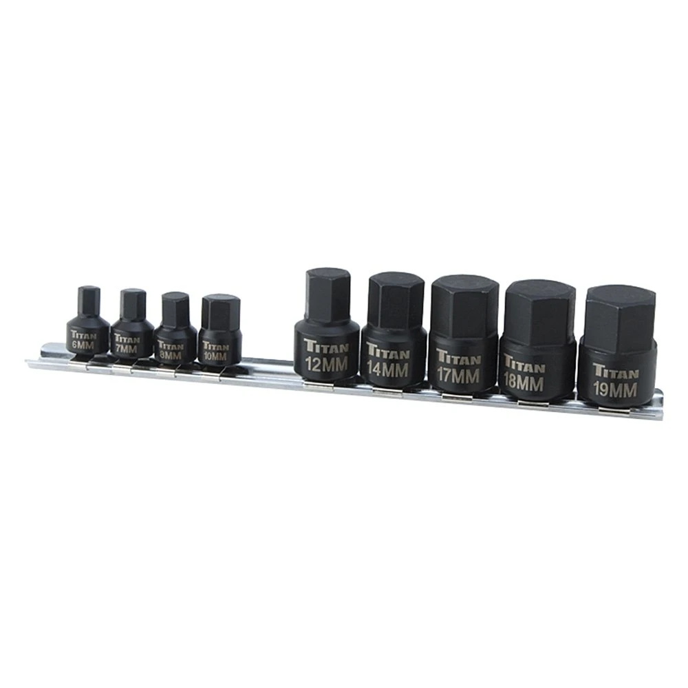 3/8″ Drive Metric Hex Stubby Impact Bit Socket Set (9 Pieces) by Titan Tools®. This top-grade product is expertly made in compliance with stringent industry standards to offer a fusion of a well-balanced design and high level of craftsmanship. Manufactured from industry-leading materials using up-to-date equipment, it ensures everlasting reliability and enduring value. This product is distinguished by total quality assurance, unsurpassed by anybody else.