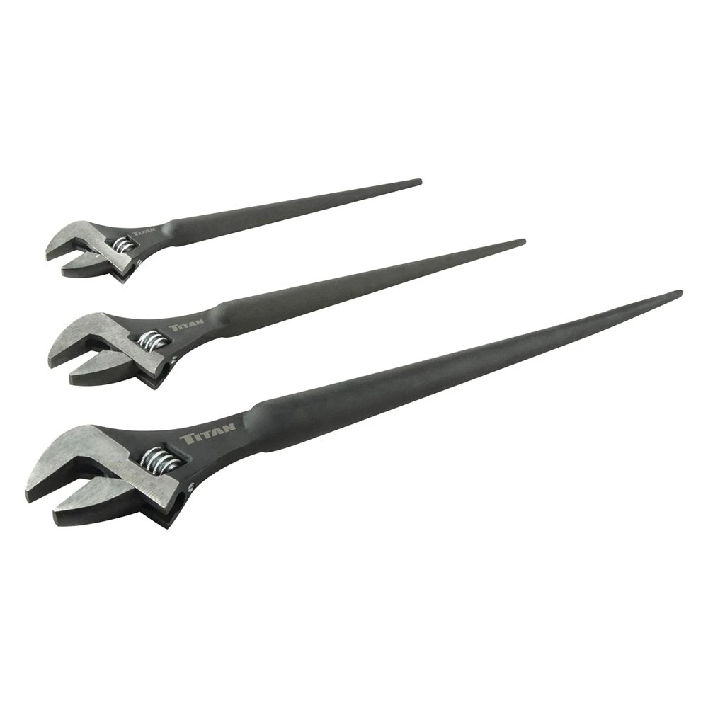 3-piece 1-1/8″ to 1-1/2″ Black Oxide Adjustable End Spud Wrench Set by Titan Tools®. If you’re looking for a reliable solution to complete your project, this 1st-grade product is right up your alley. Designed utilizing the finest materials, it delivers unmatched levels of durability and strength needed to provide long-lasting service life. Superior in functionality, it will help you make any job easier and faster.