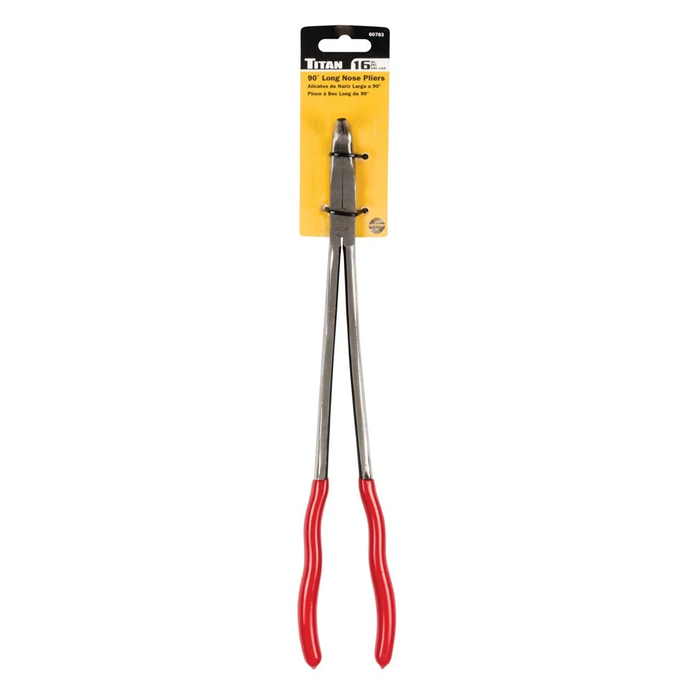 16″ Box Joint Bent Jaws Dipped Handle Long Reach Needle Nose Pliers (60783) by Titan Tools®. This top-grade product is expertly made in compliance with stringent industry standards to offer a fusion of a well-balanced design and high level of craftsmanship. Manufactured from industry-leading materials using up-to-date equipment, it ensures everlasting reliability and enduring value. This product is distinguished by total quality assurance, unsurpassed by anybody else.