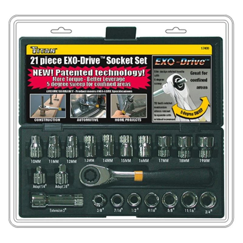 Exo-Drive™ Mixed Drive Size SAE/Metric Ratchet and Socket Set, 21 Pieces by Titan Tools®. This top-grade product is expertly made in compliance with stringent industry standards to offer a fusion of a well-balanced design and high level of craftsmanship. Manufactured from industry-leading materials using up-to-date equipment, it ensures everlasting reliability and enduring value. This product is distinguished by total quality assurance, unsurpassed by anybody else.
