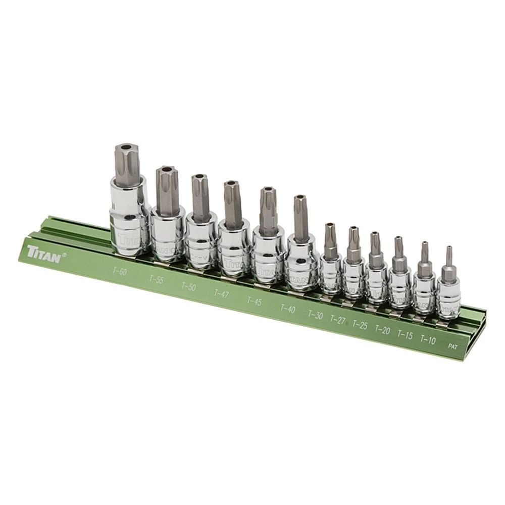 Mixed Drive Size Torx (TR) Bit Socket Set 12 Pieces by Titan Tools®. This top-grade product is expertly made in compliance with stringent industry standards to offer a fusion of a well-balanced design and high level of craftsmanship. Manufactured from industry-leading materials using up-to-date equipment, it ensures everlasting reliability and enduring value. This product is distinguished by total quality assurance, unsurpassed by anybody else.