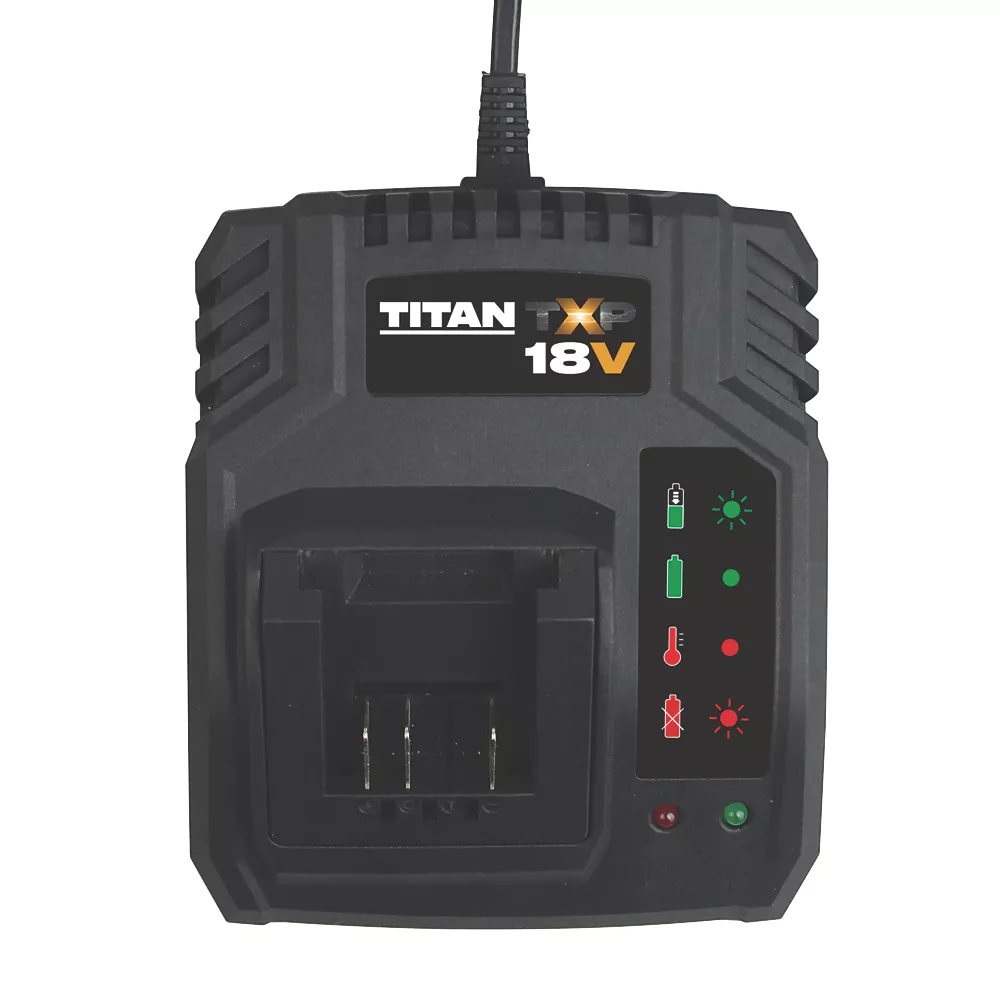 2.4A charger compatible with Titan TXP batteries. Charges 1.5Ah batteries in 50 minutes and 2.0Ah batteries in 60 minutes.